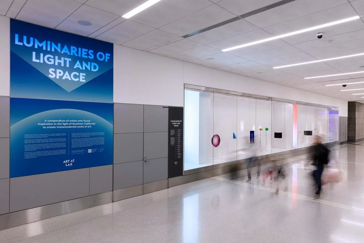 DUBLAB and the LAX Art Program present an exhibition highlighting pioneers and innovators of one of Los Angeles’ most notable homegrown visual art movements, the Light and Space Movement. Curated by Laura Whitcomb of Label Curatorial, artists featured include Peter Alexander, Larry Bell, Gisela Colón, Laddie John Dill, Fred Eversley, Robert Irwin, John McCracken, Helen Pashgian, Hap Tivey, and De Wain Valentine. The Light and Space Movement explores how light creates permutations within the spectrum of color through the use of Space Age materials and technology that define fields of luminous experience. By condensing the energy of light into sculptural mass, subtle endless space and refraction appear within their rigid forms. The works on view represent minimalistic forms, and, when engaged with, create spectacular phenomena only visible to the naked eye. Photography and documentation are often unable to reproduce the infinite arrangements of light and color as well as the refractions and nuanced spectral variants created by each artist.